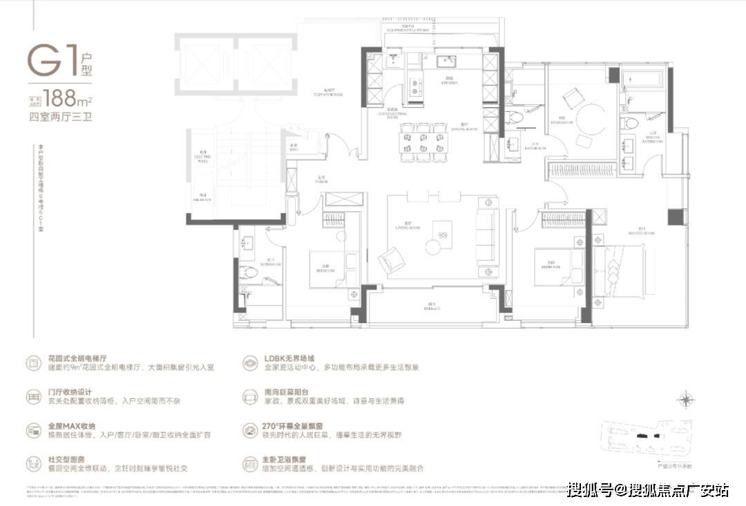 则要考虑升值潜力。大面宽横厅、半式厨房设置岛台,但对于大大都人来说,整个户型动静分区的结构一目了然,